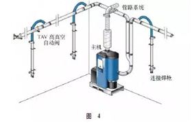 主機(jī)(含過(guò)濾器及控制系統(tǒng))及管道、真空閥門、軟管及焊槍五個(gè)主要部分組成,當(dāng)有任一臺(tái)焊機(jī)開(kāi)始工作時(shí),真空閥門通過(guò)其固定在焊機(jī)上的感應(yīng)裝置感應(yīng)到信號(hào),啟動(dòng)高真空閥門,閥門上的感應(yīng)開(kāi)關(guān)同時(shí)傳信號(hào)給主機(jī),實(shí)現(xiàn)遠(yuǎn)程啟動(dòng);