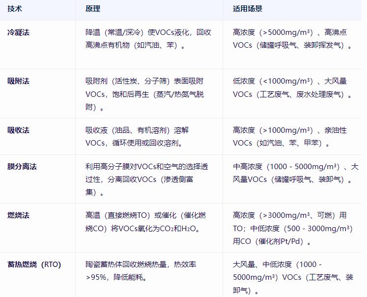 高濃度儲罐呼吸氣:先冷凝回收汽油/苯(回收率70-80%),殘余氣再吸附(活性炭)或膜分離,最后燃燒(TO/RTO)。