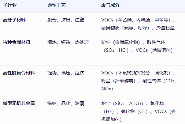 新材料生產(chǎn)涉及合成、改性、成型等工藝,廢氣來源及成分差異顯著,需分類解析: