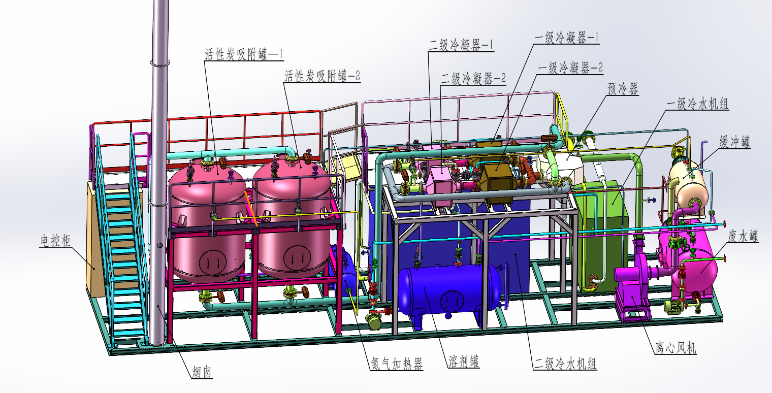 高濃度廢氣(≥5000mg/m³)采用“冷凝回收+RTO”工藝,先回收高價值溶劑降低原料損耗,再將未冷凝廢氣送入RTO焚燒處理,凈化效率≥99%,兼顧資源回收與達標排放;中濃度廢氣(1000-5000mg/m³)采用“冷凝+活性炭吸附脫附”工藝,吸附飽和后通過高溫氮氣(純度≥99.9%)脫附,高濃度脫附氣返回冷凝系統(tǒng)回收,提升資源利用率;低濃度惡臭廢氣采用“冷凝+生物洗滌”工藝,既去除VOCs,又針對性降解含硫、含氮惡臭物質(zhì),除臭效率≥95%。